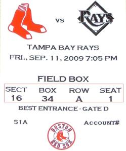 Friday’s Red Sox game against Tampa Bay was cancelled and rescheduled for today because of all the rain. Through a strange twist of fate, I gave my two tickets away because the friend I was bringing to the game came into even better seats than I had purchased.