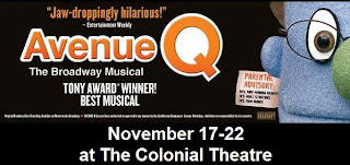 I last saw AvenueQ in Boston at the Opera House in March of 2008. Sadly, I won’t be able to see the show this time around since I’ll be out of town, but I would strongly encourage you to consider purchasing tickets to see this Tony Award winning musical, which I can only describe as Seasame Street meets NYC.
