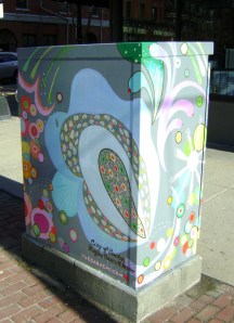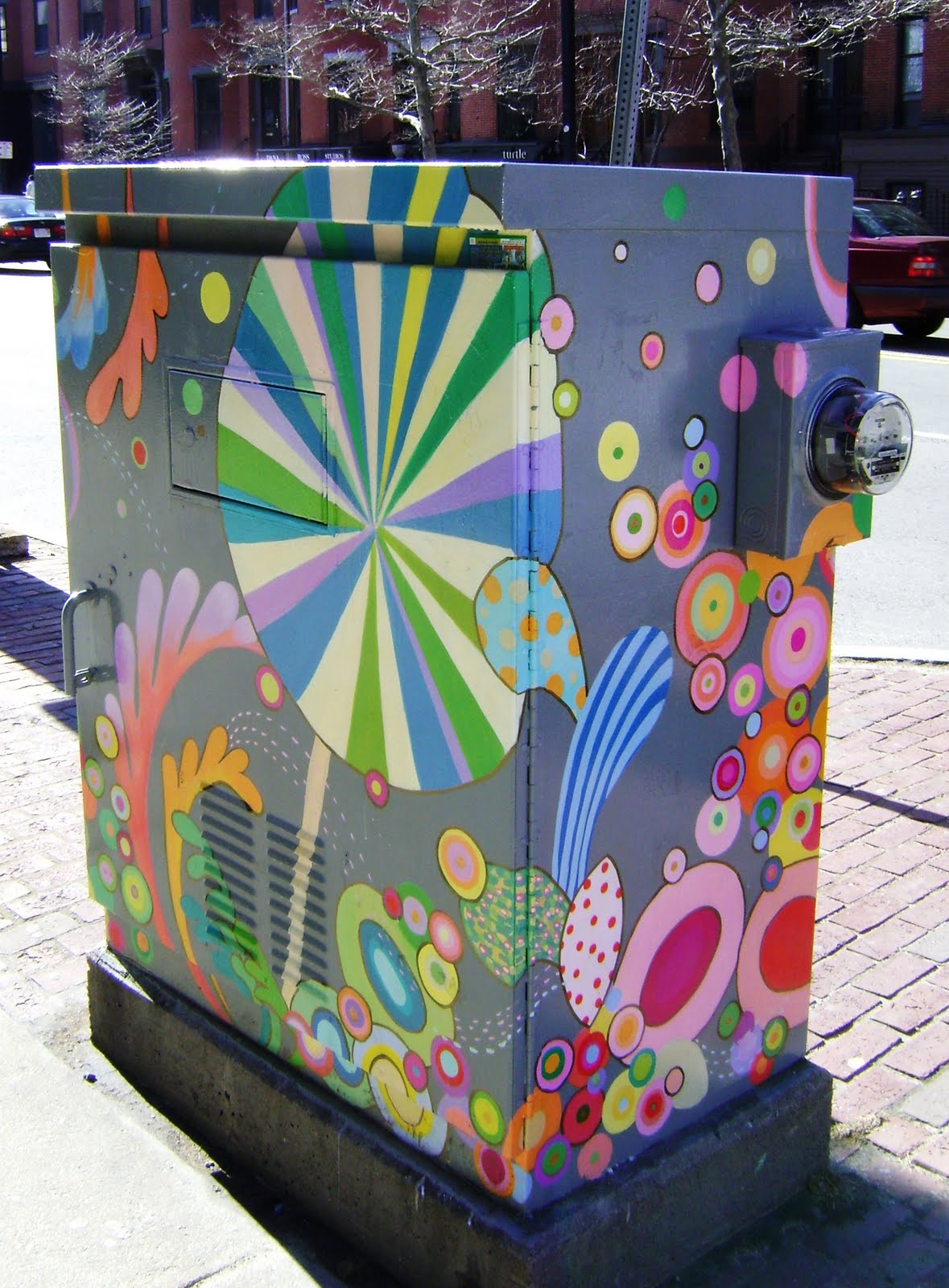 Today’s Boston Globe has an article entitled, “Painting outside the box”. The article is about a city program that commissions street art. According to the article, two dozen local artists have been brought in by the Boston Arts Commission as part of its PaintBox program, which is being modeled after similar efforts in Cambridge and Somerville. The program started slowly last year with only 13 boxes painted, but it has quickly expanded to more than 40. I’m a huge fan of public art and hope it continues. A utility box has been decorated in my neighborhood on the corner of Dartmouth and Tremont Street. Click on the picture to make it larger and find out more about the artist by visiting their website.