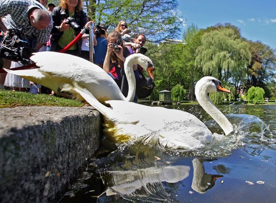 Earlier today Boston’s favorite same sex couple returned to the Boston Public Garden. Romeo & Juliet, the two graceful swans that make the pond in the Public Garden their home are back. Back in 2005 (just a year after same sex marriage was legalized in MA) it was learned that Romeo is in fact a female, which caused many conservatives who like to scream about how unnatural homosexuality is to cry foul (or was it fowl?)!