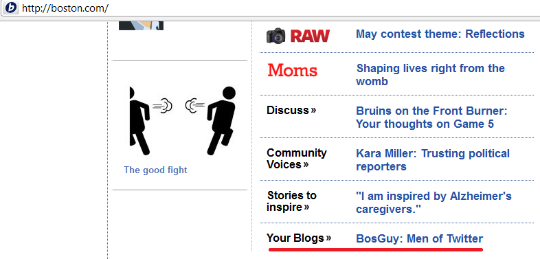 Wow, my weekly post the #MenofTwitter has been featured in the community section on the homepage of Boston.com – The Boston Globe’s online site. I have to admit I was definitely taken by surprise and it made me smile. I’ve been reading boston.com since its inception and have it as my homepage. Thank you Joe for bringing this to my attention.