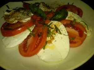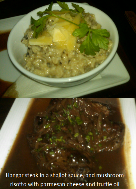 I started with a tomato, basil and mozzarella salad. Along with the french bread at the table this provided an excellent beginning. The tomatoes and basil were extremely fresh and the cheese was as rich and creamy as it should be. Soon after our first plates were cleared, my main plate was brought over to our table. I ordered grilled hangar steak with shallot sauce, mushroom risotto, parmesan and truffle oil. The steak was cooked to perfection (pinkish-red in the middle) and smothered in the rich shallot sauce. The risotto with cheese and truffle oil complemented the steak, and I found myself going back and forth between the meat then the risotto.