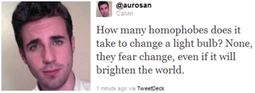 Tweeted by @aurosan a self-proclaimed loud, opinionated homo (my favorite variety). In light of my previous post about the lecture I attended last night, I figured I’d share this “enlightening” (I know – feel free to groan at my corny choice of wording) tweet. Perhaps you’d like to follow this witty New Yorker.
