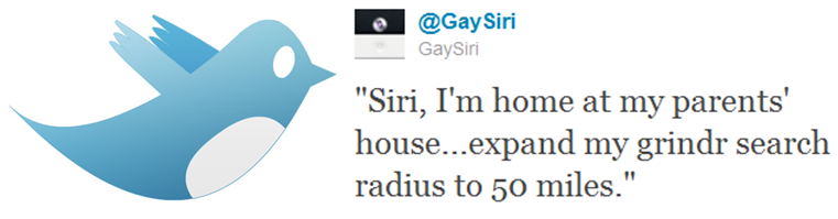This Tweet was actually sent during the Thanksgiving Holiday but I figured it has lasting power and could be shared at any time. If you are unfamiliar, check out GaySiri (and ask her to Tweet a bit more often – she’s really quite funny).