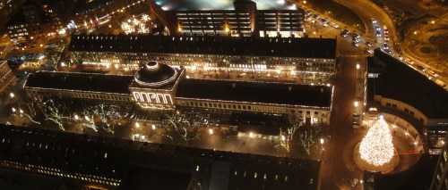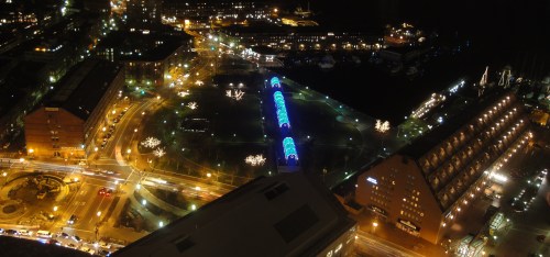 The lower left of the picture is part of the Rose Kennedy Greenway which replaced Boston’s elevated highway. The upper left of the photo shows the North End (Boston’s Little Italy); where my grandmother grew up and my brother currently lives. The A-frame building to the right is the start of Long Wharf (where I catch the high speed ferry to Provincetown). Lastly, the blue lights are actually covering an extended arch that runs through the North End’s popular Christopher Columbus park and overlooks Boston Harbor.