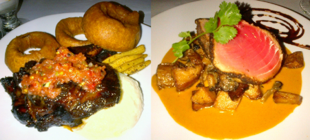 Photographed below is the dinner special – pork chop with ranchero tomato salsa, grilled baby corn, large chile onion rings, and garlic whipped potato for $26.95. And a signature dish at Masa, blackened rare ahi tuna steak on yellow mole and accompanied by potatoes and wild mushrooms for $24.95.  Both meals were very flavorful and filling.  The only knock against the food was the seafood special (not shown) it was so light and the portions so much smaller that the couple who ordered this left Masa still a bit hungry. By contrast the portions shown below were large and heavy enough that we were sated.Masa is not the place one visits for a serious conversation or a romantic “date night” but it offers a creative menu filled with options that tempt both in liquid and solid form.  If you have not tried Masa (or in our case if it has been a few years), I’d encourage you to give the place a try.  They also have a boisterous bar filled with several options again in liquid and solid form sure to tempt you.