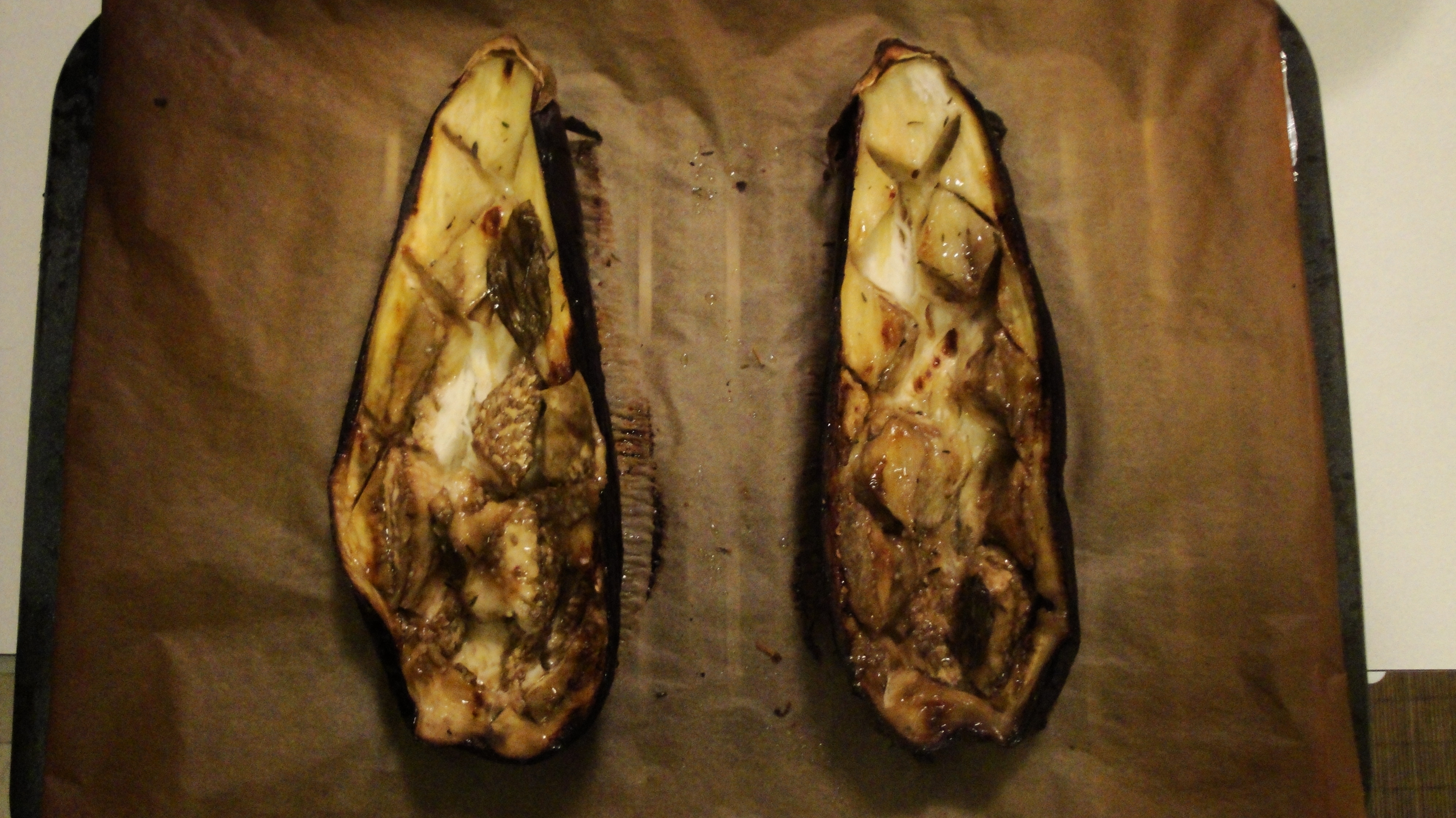 After roasting, let the vegetable cool for 15-20 minutes. The picture below shows the eggplant flipped over after it has roasted and cooled.
