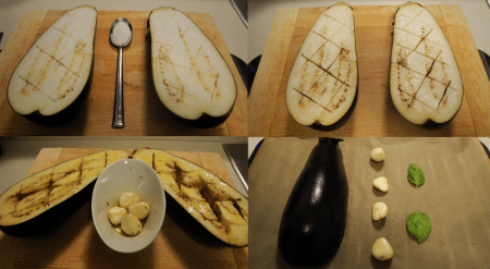 STEP 5: As shown in the last photo (from the series above) flip the brushed eggplant halves on parchment paper (I also place two basil leaves on the parchment that the eggplant will cover – I love basil). Cook for 45 minutes.