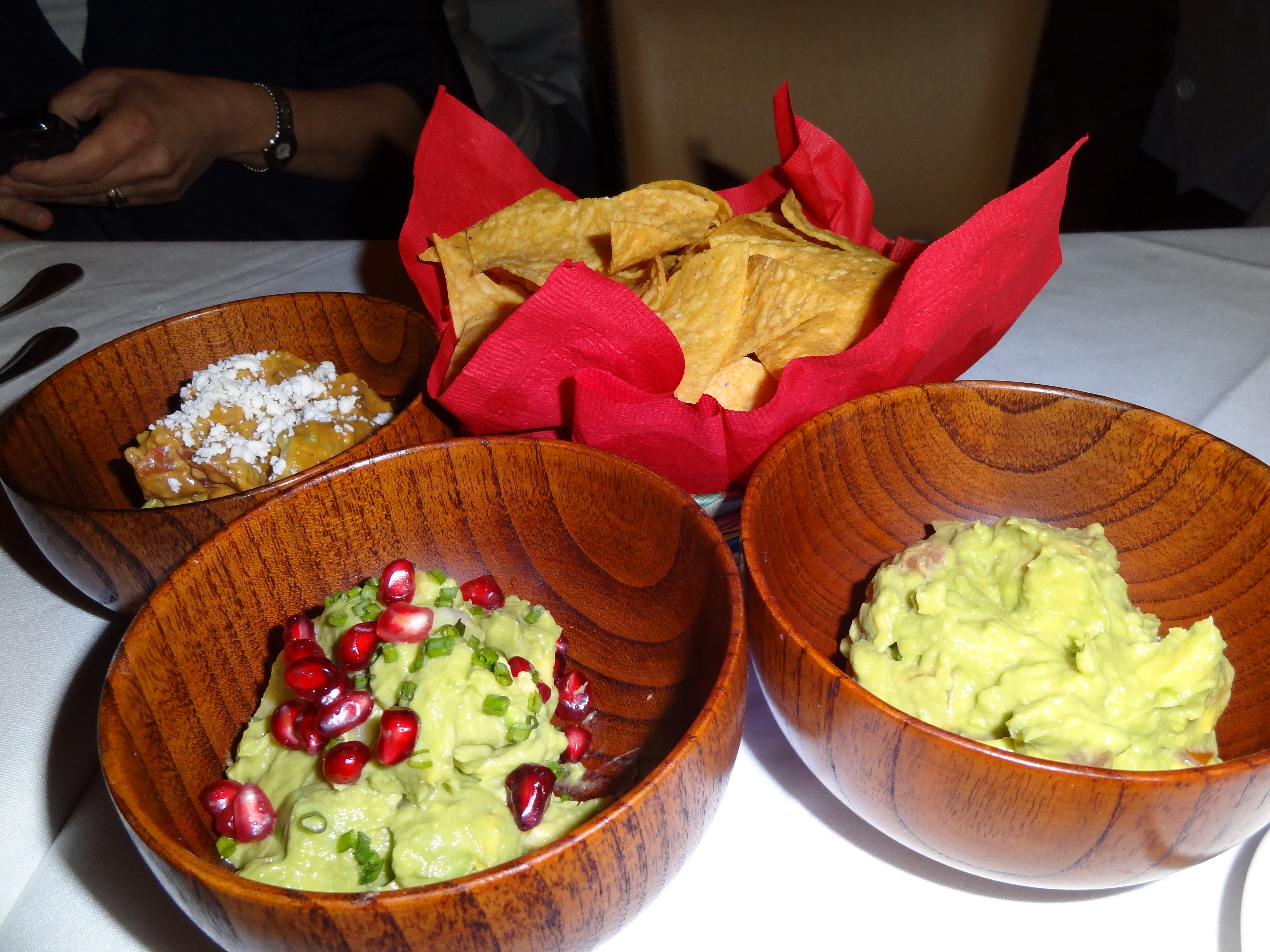 I first ordered the red sangria (depicted above). Unfortunately, Toloache does not serve this by the pitcher so beware how quickly the tab will add up. We started with the Guacamole sampler depicted below, and of the three, all of us liked the “Rojo” best. This is the one depicted with the queso fresco on top.