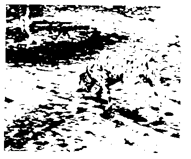 The photo is a picture of a dog drinking from a stream, with its head in the middle of the picture facing down to the water and its tail off to the right.