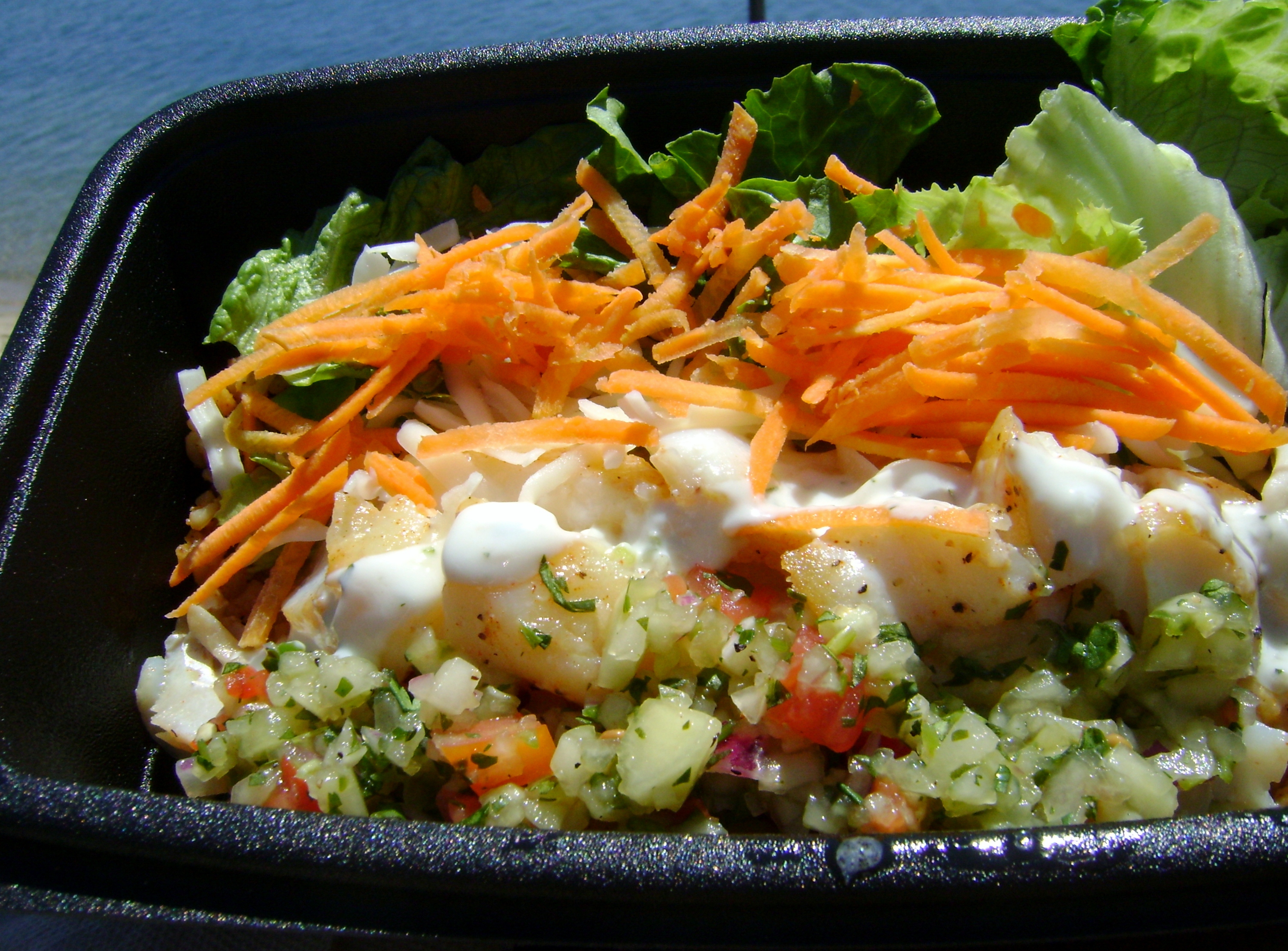 Below is a photo of the “Catch of the Day” burrito in a bowl ($8.50). The portions are plentiful enough and the lime-cilantro yogurt sauce with the cucumber salsa makes this one of the best deals in town. Its even better accompanied by a cold beer at the Aqua bar.