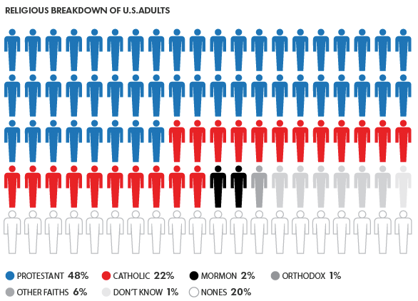A recent report from BBC cites Protestants are no longer a majority in the US. According to a recent Pew survey, only 48% identify as Protestants.  Coincidentally, NPR published a report that 20% of Americans now identify themselves as “religiously unaffiliated” or “Nones”.  According to the NPR article, there is little evidence to show this population will become more religious as they get older.