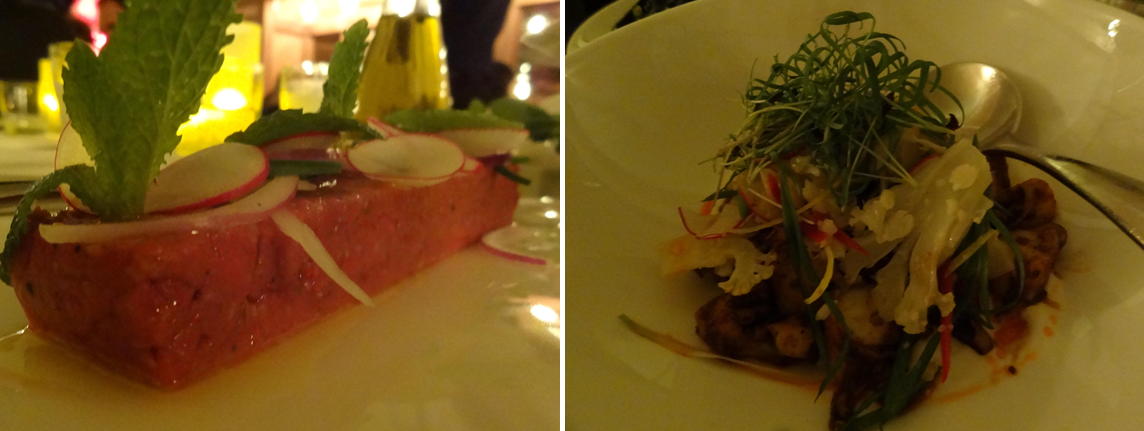We opted to forgo ordering a main dish and instead ordered several small plates so we could sample as much as possible. Our waiter, Danny, was knowledgeable and very helpful making excellent suggestions on what to try.  All our dishes ranged from $9.00 to $19.00.ilili NYCTwo of our more filling plates were Kibbe Naya $15 (raw lamb kibbe, served with chopped red onions, radish and mint) and Grilled Octopus $19.  Both were very good, but surprisingly I enjoyed the Kibbe Naya more than the octopus which seemed mundane by comparison.  I gobbled up the Kibbe Naya with the small warm pita bread served and a garlic spread that was fragrant and creamy.