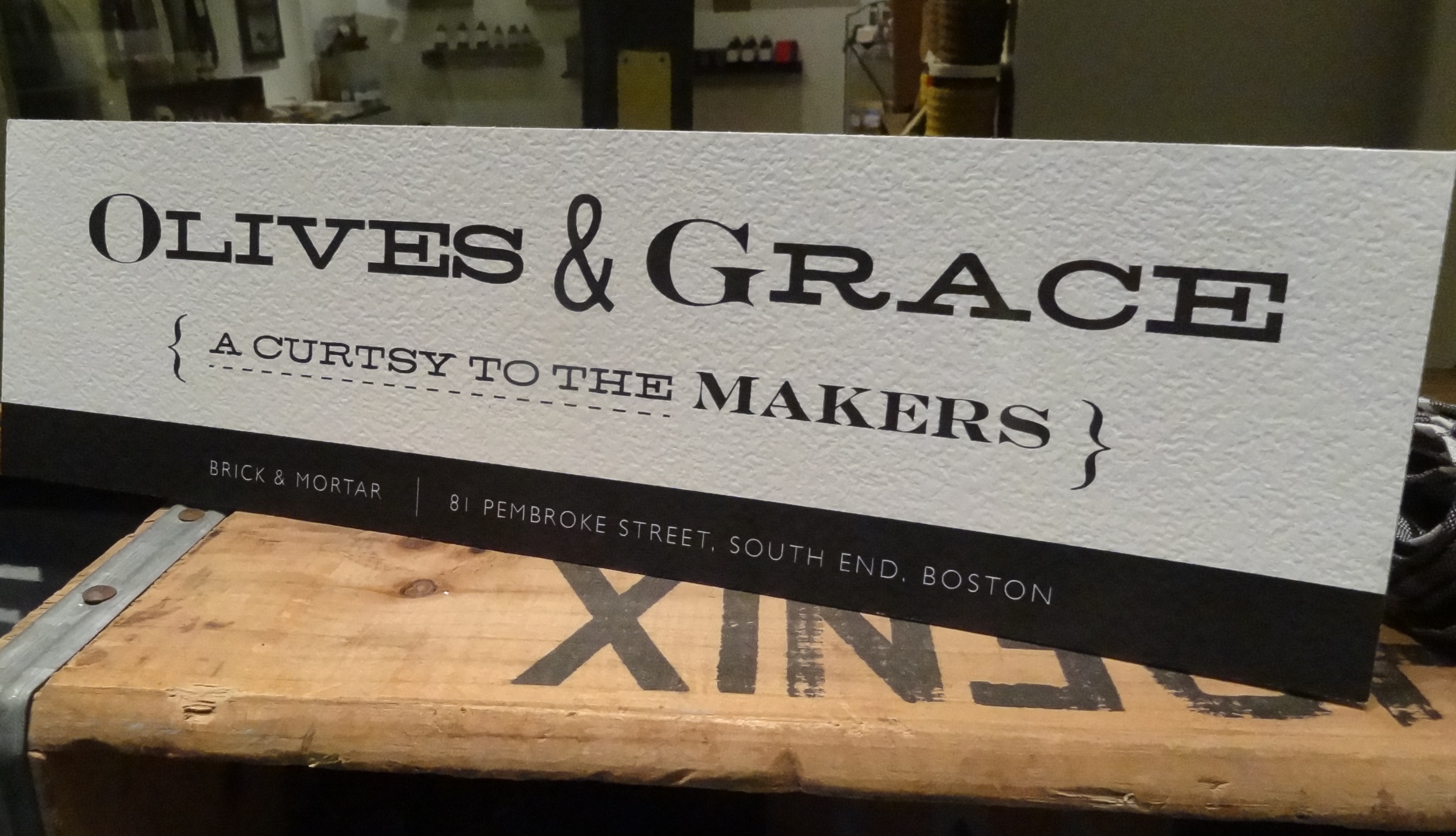 Last weekend I stumbled upon a relatively new storefront just off of Tremont Street in the South End called Olives & Grace. Sofi, the owner of this cute shop, seeks to “feature emerging artists, gift producers, and small batch food makers“. The store struck me as the perfect place for purchasing custom gift packages.