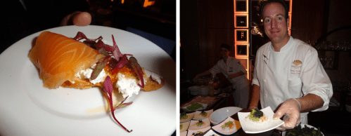 When it came to my favorite foods, I have to tip my hat to Post 390. They served a delicious house smoked salmon, garlic chive goat cheese with a touch of jalapeno jelly (below left). Asana also deserves a nod for the bay scallop sashimi with a bacon vinaigrette and togarashi kale chips (below right). These combined for my favorite dishes served at an otherwise lacking tasting.