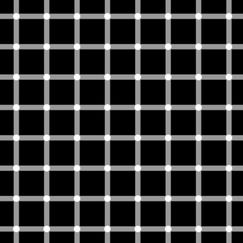 So why do we see the black dots? The receptive field of the retina light and dark receptors compete with one another to become active.  Once a receptor is active it inhibits adjacent receptors and it is this inhibition that creates the contrast.