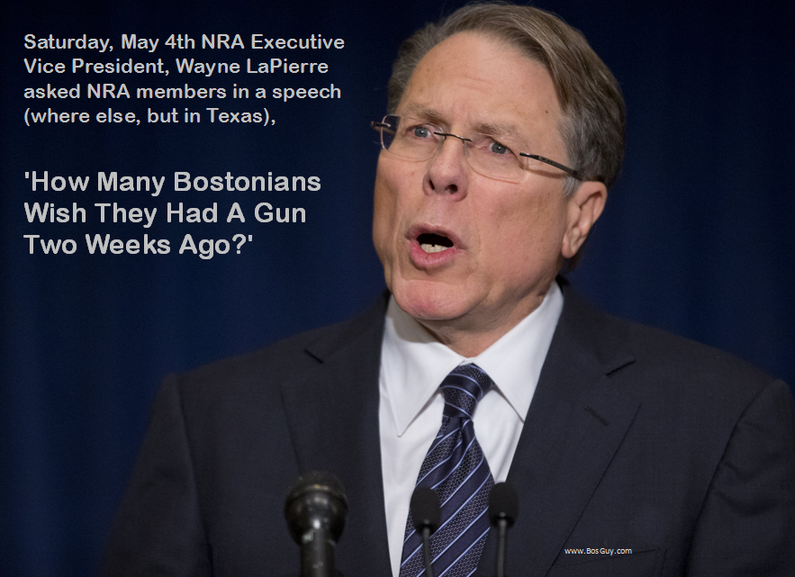 Apparently I spoke too soon. Today in a speech to NRA members in Houston, Texas, Wayne LaPierre, Executive Vice President of the NRA, was quoted as saying How many Bostonians wish they had a gun two weeks ago?