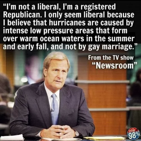 This quote from the HBO series, Newsroom, perfectly describes the main problem I have with the Republican Party. One might choose to believe that the Republican Party isn’t quite that extreme, but I’d like to remind everyone of the responses from many in the Republican Party after the Supreme Courts’ rulings on the Defense of Marriage Act and California’s shameful Prop 8.