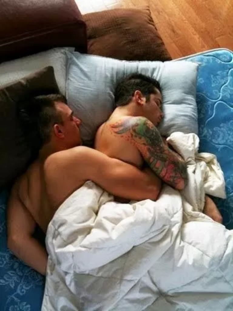 spooningOne can only imagine the night these guys must have had.  No bed sheets? No pillow covers? Enjoy your Saturday morning.