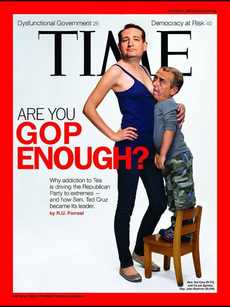 This is a brilliant spoof of Time Magazine’s notorious May 2012 breastfeeding cover. Somehow the Photoshopped heads of Tea Party wingnut Senator Ted Cruz (R-TX) and our sycophant Speaker of the House, John Boehner (R-OH) is both upsetting and spot on.