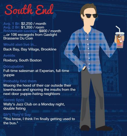 Link here to see the full infographic that includes similar caricatures for: Allston, Back Bay, Beacon Hill, Brighton, Brookline, Cambridge, Charlestown, East Boston, Fenway, Financial District, JP, North End, Somerville, South End, Southie, and West End.