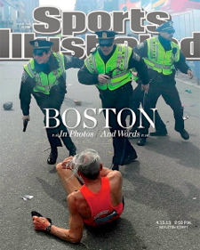 Check it out. Boston is back on the cover of Sports Illustrated with a tribute to the marathon tragedy and the 2013 World Series champion Red Sox. David Ortiz poses with the three Boston police officers captured in that iconic photo of the BPD running down Boylston Street with smoke billowing after the second explosion. Kudos to the out and proud Boston Police Officer, Javier Pagan, shown in the far left above and far right below for his heroism and service.