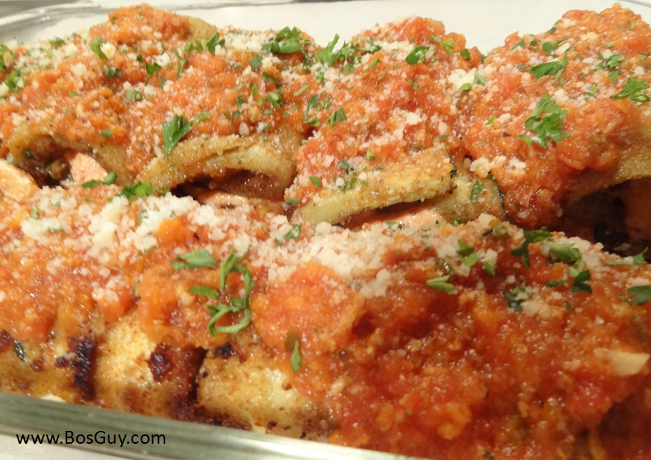 Ingredients for this meal include: Tomato / red sauce, Eggplant, Ricotta cheese, Roasted Red Bell Pepper, Roasted Garlic clove, Eggs, Bread crumbs, Parmesan cheese, Parsley, Olive oil, Italian seasoning, Salt and Pepper.