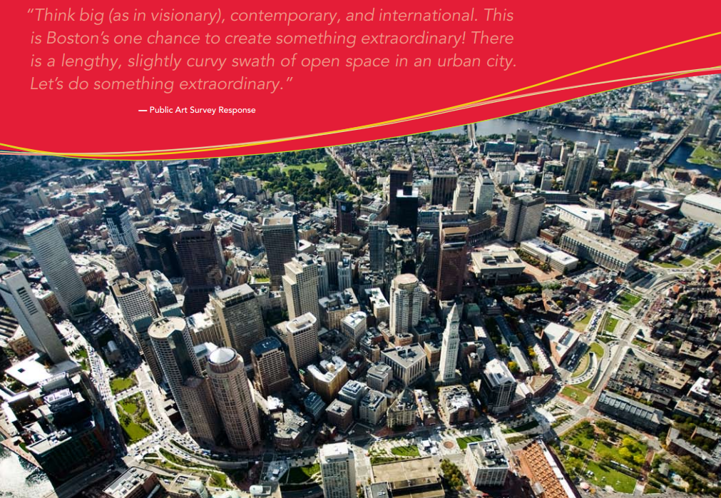 The quote and image atop this post is from the Rose Kennedy Greenway’s Public Art on the Greenway: A Five Year Strategy 2013-2017. The Greenway’s vision for this work (according to their website) is to bring innovative and contemporary art to Boston through free, temporary exhibitions on the Greenway that engage people in meaningful experiences, interactions and dialogue with art and each other. I won’t wax on about the potential here – I’ll keep my trap shut (for now). Want to learn more about this? Check out the Greenway’s Public Art Program web page, here.