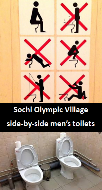 Gay SochiConsidering how uptight Russia seems to be about man-on-man action, it is puzzling that they would actively encourage pairs of men to share bathrooms like this.  Don’t they realize gay cruising pretty much started here?  This is clearly another case of people needing to know their history.  Despite the Mayor of Sochi’s claims that no gay people live here, that can’t be said for the Russian Olympic village.