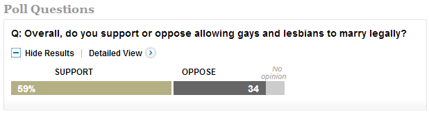 Last week ABC News and The Washington Post released findings from a marriage equality poll. The findings show that support for marriage equality is at an all time high with 59% of those surveyed indicating their support; up from just 32% in 2004 when Massachusetts first legalized same-sex marriage.