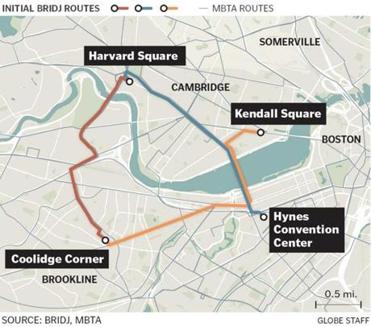 Have you heard of Bridj? Earlier this month The Boston Globe referred to it in their article as a first-of-its-kind “pop-up” bus service. Whatever you call it bridj is scheduled to begin trial runs in May with at least 4 nonstop commuter routes in Brookline, Boston, and Cambridge (see image below). If successful, plans include adding up to 18 routes in the next three months to help commuters get around town.