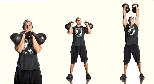 This is just like a kettlebell overhead press, but with the mass of the kettlebell pointing toward the ceiling, and it is a killer workout that helps to build shoulder strength and stability.