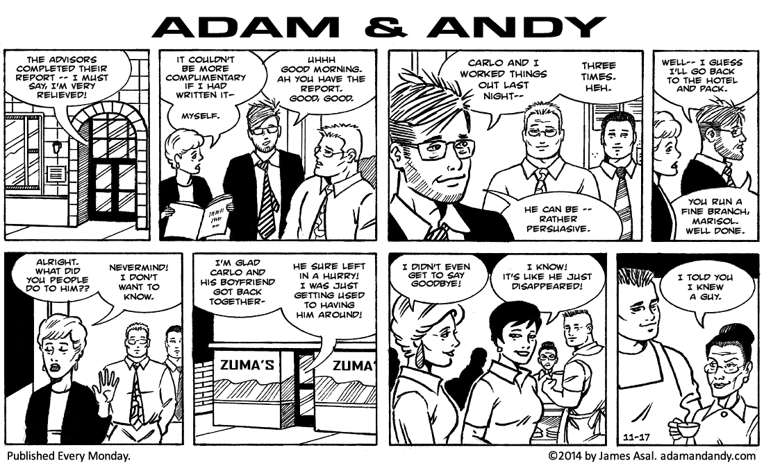 ADAM & ANDY is set in the fictional New England town of Woodfield, CT. You can learn more about this strip by visiting, adamandandy.com.