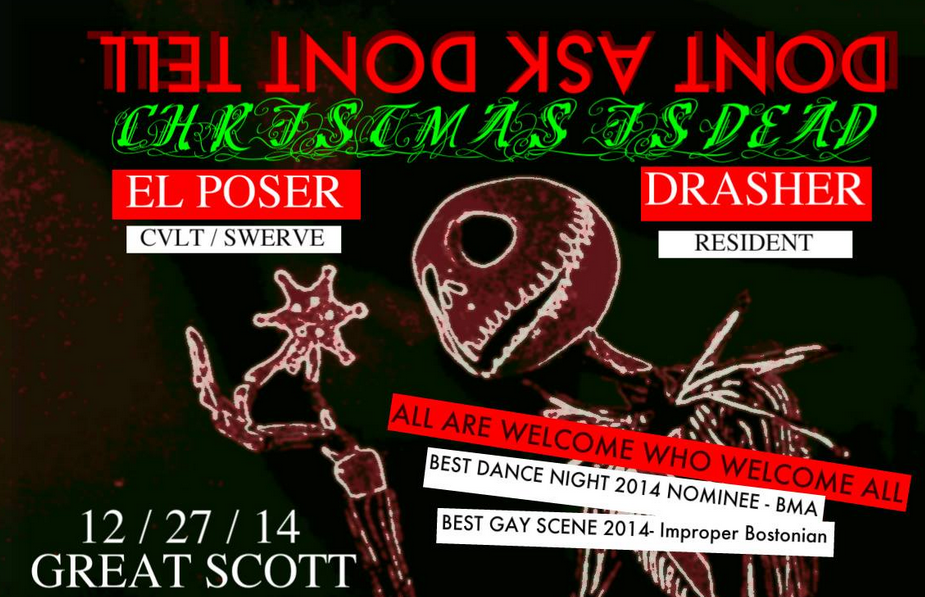 Looking for something fun to do this weekend? Check out the party in Allston on Saturday, December 27th. This month’s theme is Christmas is Dead so wear all black and come in mourning attire. The party is 21+ and there is a $10 cover charge. For more details about the party check out their Facebook page Don’t Ask Don’t Tell or visit their website, pleasedontaskdonttell.blogspot.com.