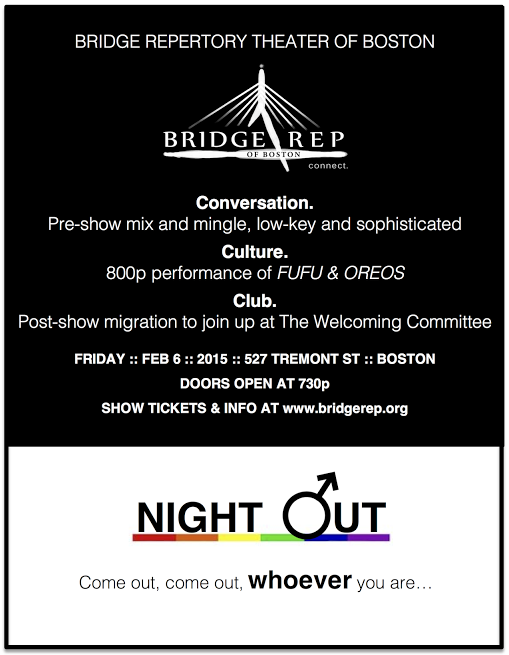 The Bridge Repertory Theater of Boston is hosting a very special LGBT NIGHT OUT performance of Fufu & Oreos, a dynamic, one-woman show about a 20-something ‘mulitculti’ as she navigates her American lifestyle, Nigerian heritage and the loaded promise of Prozac. The performance runs for 90 minutes and is followed by a post-show migration to join up with The Welcoming Committee.