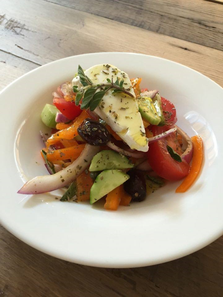 Horiatiki (tomato, cucumber, bell pepper, red onion, olives, feta cheese, oregano, and olive oil)