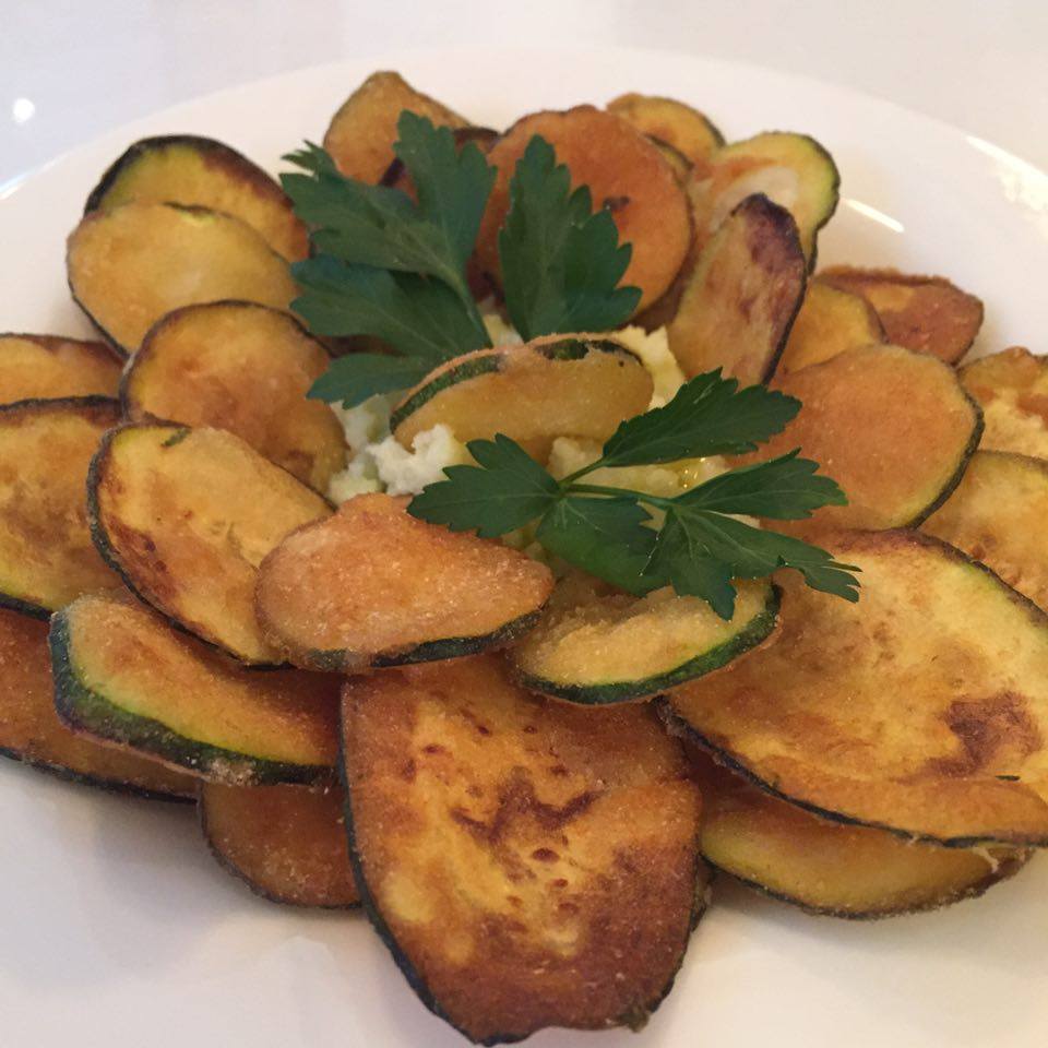 Kolokithakia (zucchini chips with scordalia)