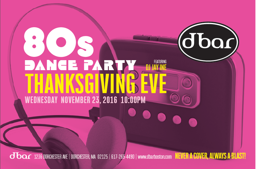Thanksgiving Eve 80s Dance Party listen to your favorite music from the 1980s at dbar on Thanksgiving Eve, Wednesday, November 23 in Dorchester