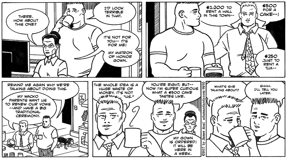 After a brief hiatus, I wanted to share a couple of Adam and Andy cartoons by James Asal Jr. Over the past few weeks Adam and Andy have been busy planning a wedding, getting married and as the final cartoon will show, reliving their honeymoon night. You can enlarge these comic strips by clicking on them.