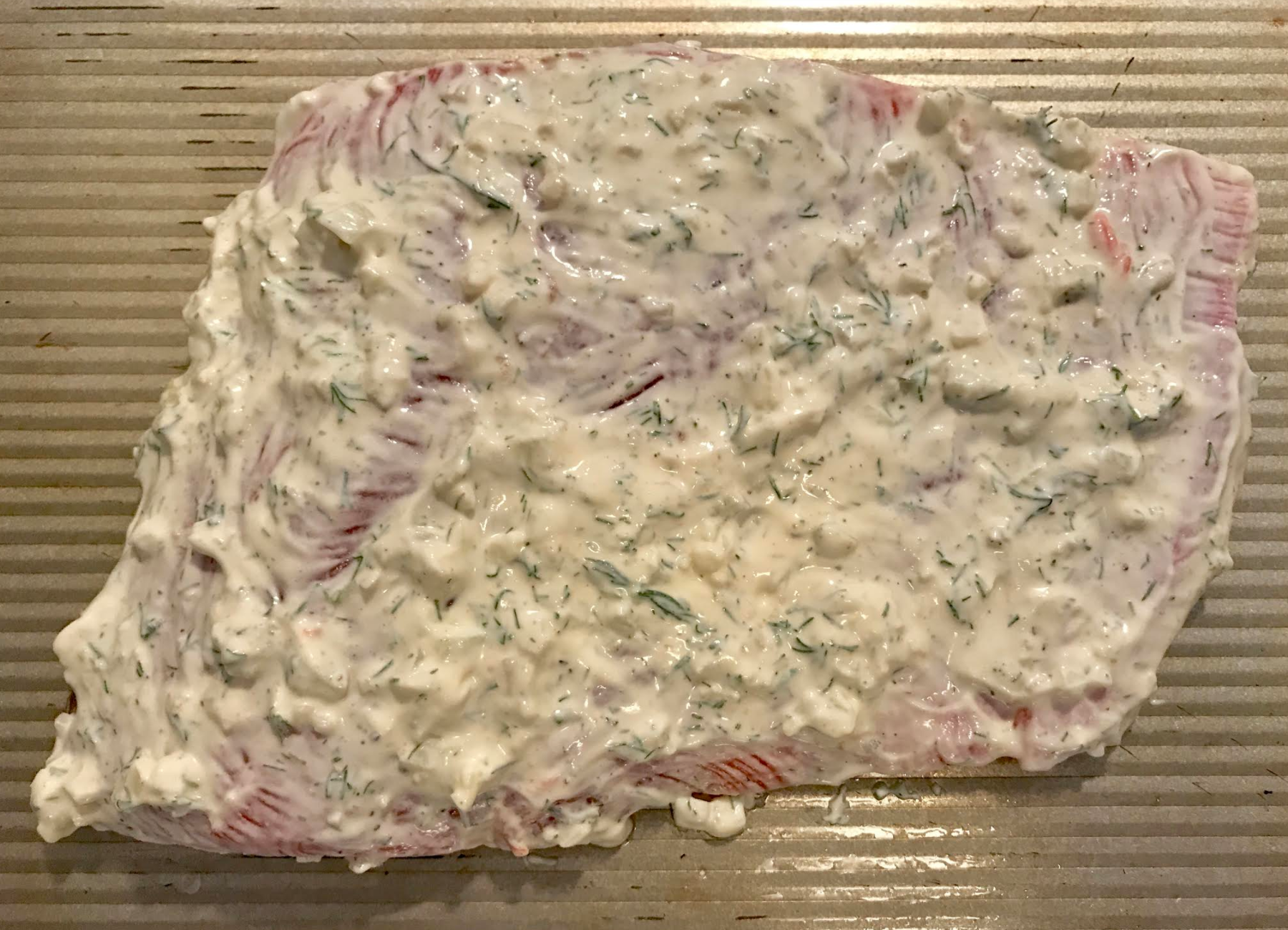 The first step is to mince approximately half of a medium sized vidalia onion and add it into a mixing bowl with the remaining ingredients: 8 ounces of sour cream, 2 tablespoons of dijon mustard and 2 tablespoons of chopped fresh dill along with salt and ground pepper to taste. Whisk the entire mixture and let it sit on the counter for 45 minutes – 1 hour. The point is to let the ingredients combine and ensure it is applied to the salmon at room temperature.