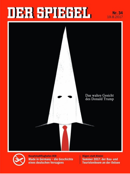 I find it depressing to see the cover of Der Spiegel mirroring  recent covers by Time, The New Yorker and even The Economist. I can spot a trend when I see one and this is not a helpful or hopeful trajectory for America. I’m curious how Republicans in Congress will work with Trump when they return to DC in September. They have a very busy calendar with important topics to be discussed ranging from raising the debt ceiling to tax reform. If something (anything) gets done, how will the electorate respond? The 2018 campaign season will be upon us before we realize it and this new normal of illustrating our President as a Nazi or KKK sympathizer cannot be good for anyone – least of all the United States.