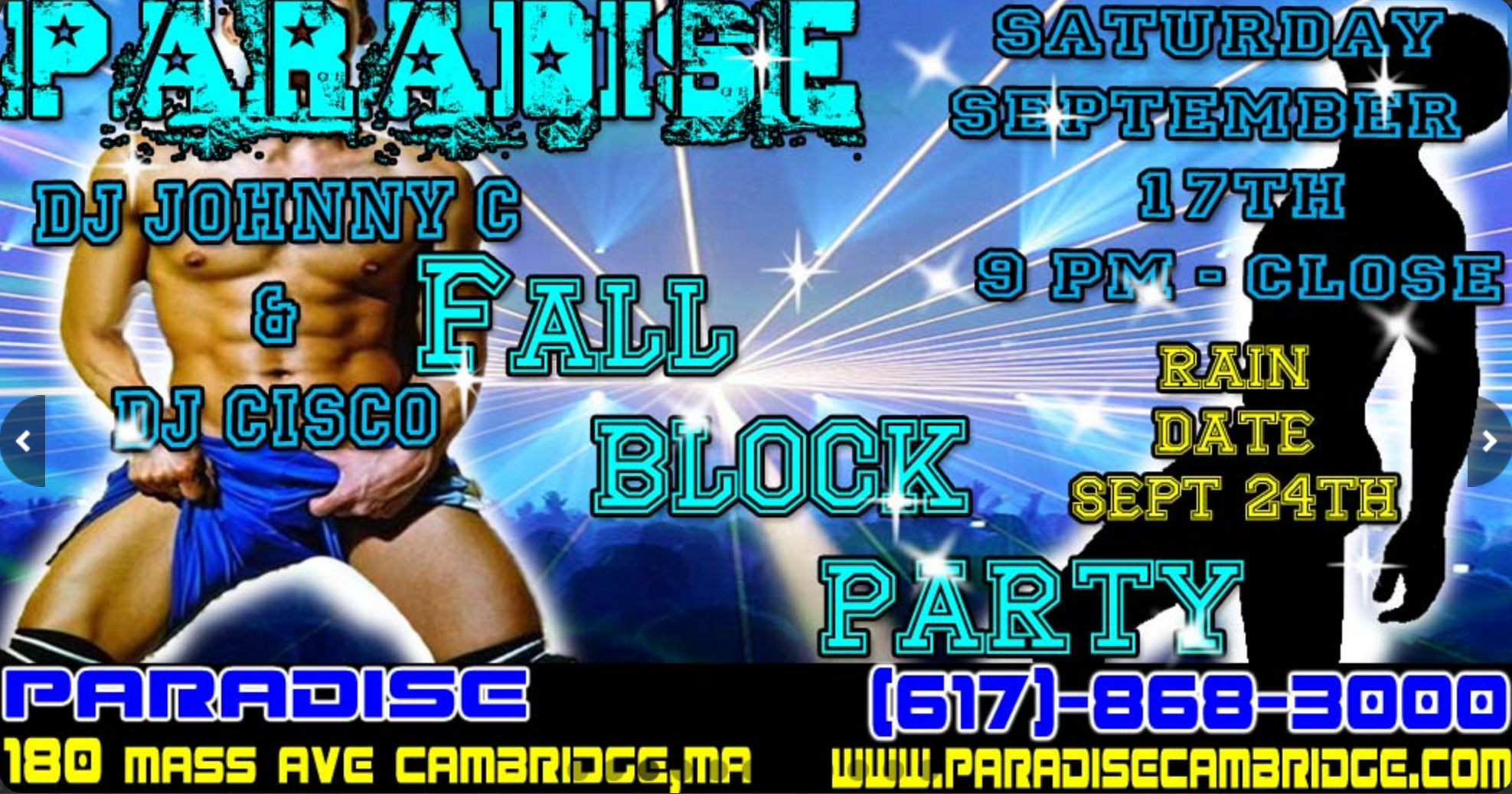 Saga Saturdays Block Party Boston’s biggest gay dance party on Saturday at Paradise heads outdoors for a massive block party in Cambridge