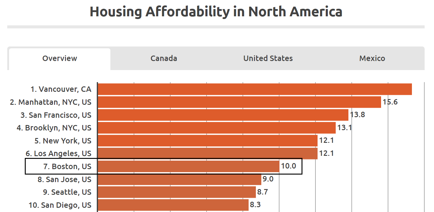 Boston was named the seventh least affordable housing market in North America recently by real estate search portal Point2 Homes, which looked at affordability ratios across North America.