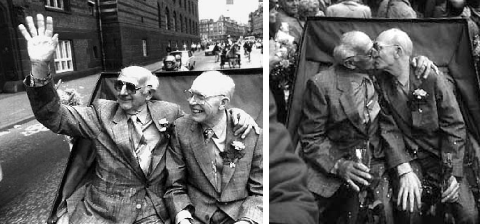 Shown above are Axel Axgil and Eigil Axgil, the world’s first couple to obtain a “registered partnership”. The photo shows them just after the ceremony, in Copenhagen, Denmark, Oct 1, 1989, following Denmark’s legalization of same-sex partnership registration in 1989, a landmark legislation which they were instrumental in bringing about. They adopted the shared surname, Axgil, a combination of their given names, as an expression of their commitment. The images are from buddybuddy.com blog.