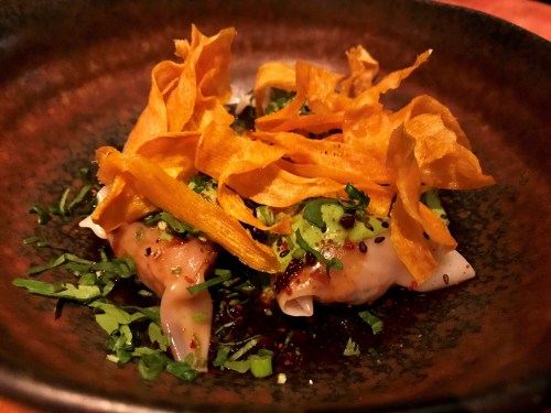 Fortunately, what followed were reasonable portions for sharing. The Chao Shou Pork wontons served in chile oil, black vinegar, cilantro and topped with crispy sweet potato crisps was both delicious and satisfying. Although picking up the slippery wontons with chop sticks proved to be too difficult for me, and I eventually succumbed to using a fork for this plate.