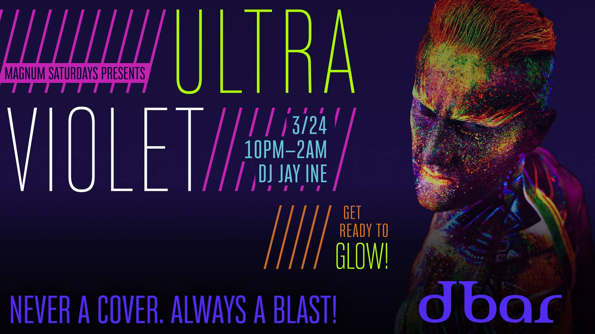 dbar Ultra Violet Black Light Party is Saturday night so put on your brightest neon clothes so you are sure to glow under the black lights