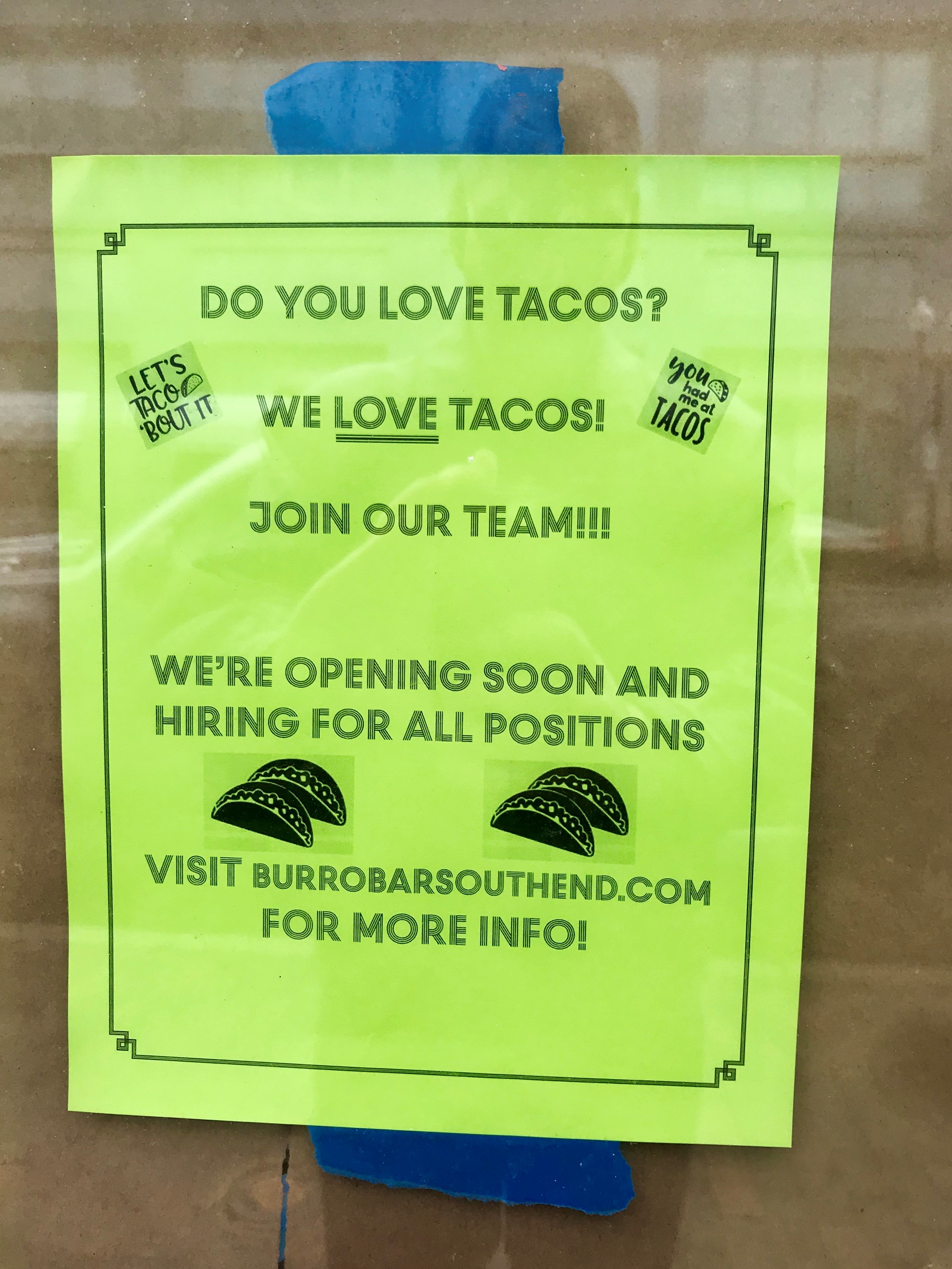 The Burro Bar, which is opening a new location in space formerly occupied by the Aquitaine Group’s La Motta Ristorante, has posted notices on its windows along Washington Street, indicating that they are now hiring for: Manager, Sous Chef, Line Cooks, Dishwashers, Hosts, Backservers, Barbacks, Servers and Bartenders in their soon to open South End location.