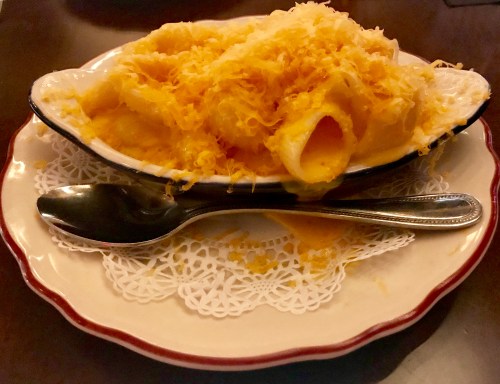 The next two plates that came out (which Sergio and I shared) included the half order (which by the way is HUGE) of pulled pork served with pickles, pickled onions and cole slaw (shown above) and the Mac & Cheese (shown below).