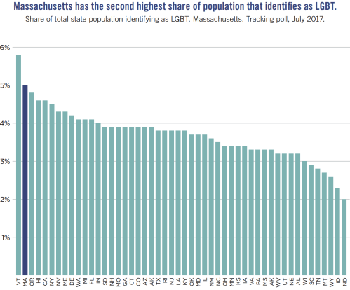 A jaw-dropping 16% of 18- to 24-year olds in Massachusetts identify as lesbian, gay, bisexual, or something else, according to researchers from Boston Indicators, part of the Boston Foundation and the Fenway Institute, part of Fenway Health. The LGBT community composes roughly 5% of the state’s population overall, making the commonwealth the “second gayest” state in the country behind Vermont, according to the report.