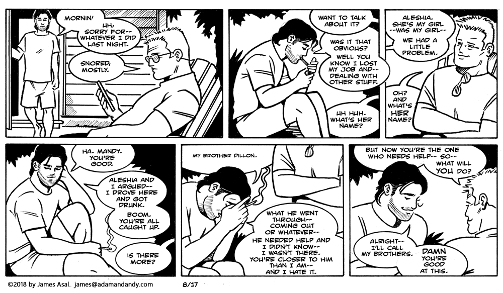 The creator of Adam & Andy posted a series of comic strips this week focused on Dillon – a young guy with a somewhat troubled past who recently has found solace at Adam & Andy’s and who also recently started dating their nephew.